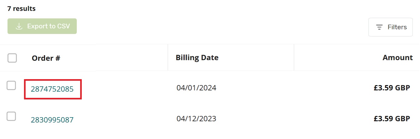 Alternatively, invoices can be downloaded as a single CSV file. Select the checkbox for the invoice(s) you wish to download. Then, click Export to CSV. Your file can be opened with spreadsheet programs like Microsoft Excel or Google Sheets.