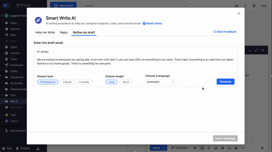 Smart Write is Titan’s built-in AI writing assistant. It helps you write new emails, reply to messages and refine drafts you’ve already started. You choose the tone and length, review the draft, then edit before sending.