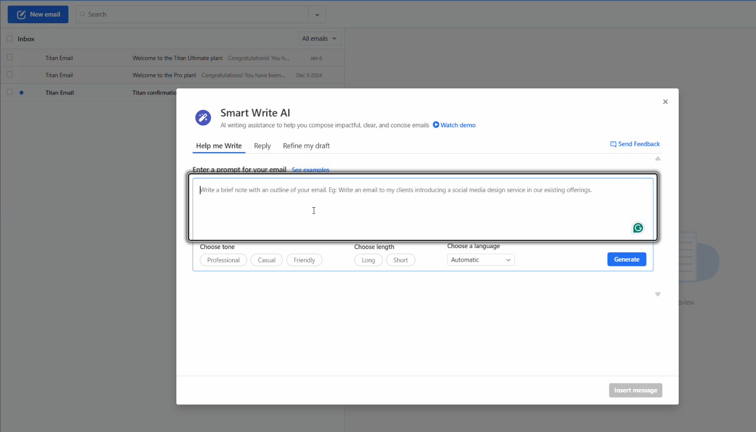Smart Write is Titan’s built-in AI writing assistant. It helps you write new emails, reply to messages and refine drafts you’ve already started. You choose the tone and length, review the draft, then edit before sending.